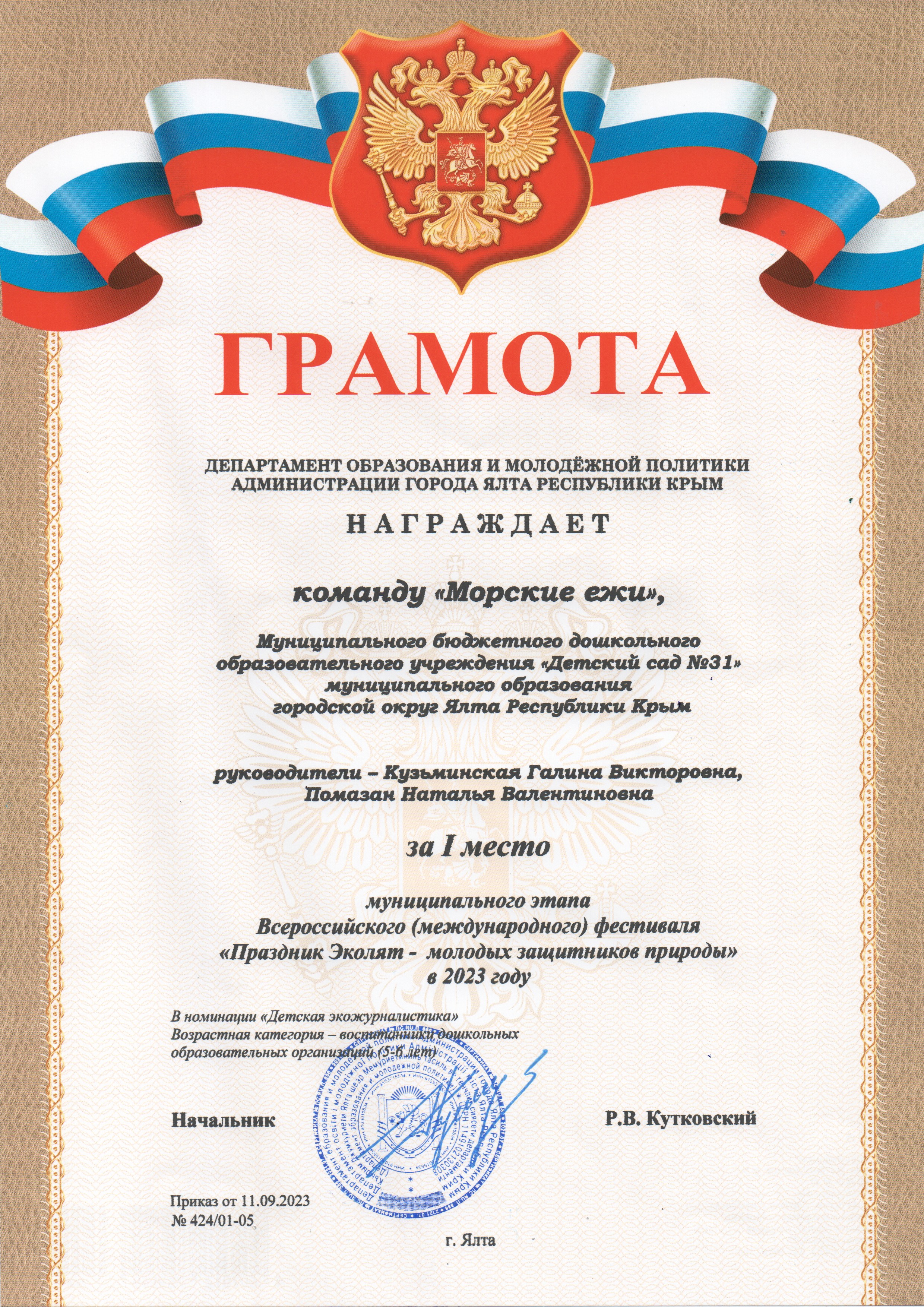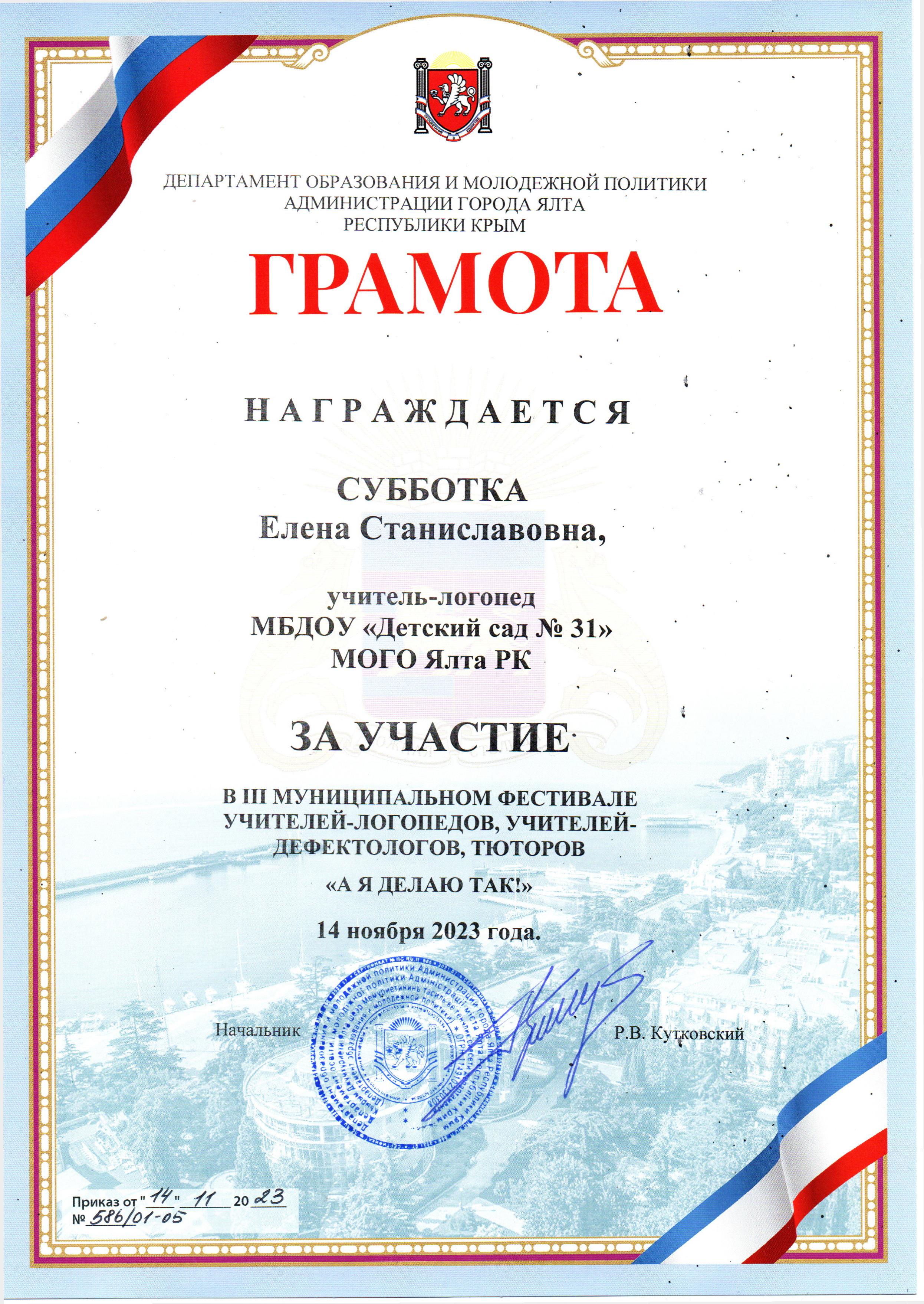 (2020 г. Грамота Управления образования Администрации города Ялта от 13.03.2020 г. № 126/ 01-05).