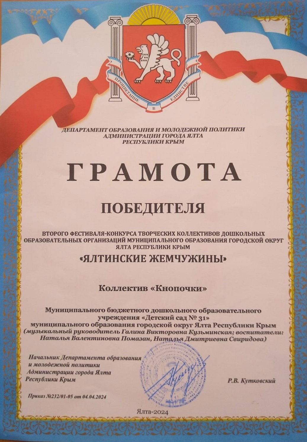 6. Участие в 1 фестивале-конкурсе творческих коллективов ДОО «Ялтинские жемчужины» (грамота за 1 место в номинациях «Хореография» и «Инструментальная музыка»: приказ от 07.04.2023 г. № 198)
